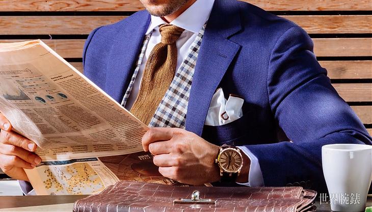 ▲浅棕色復古面盘搭配深棕色表带、浅棕色针织领带与深棕色滚边西装袋巾,透过不同的材质与色调深浅制造出层次感,展现搭配巧思与聪明。