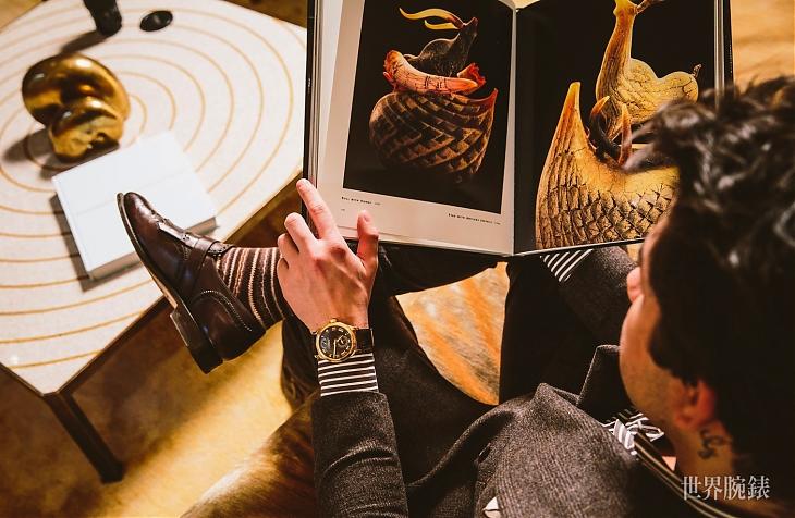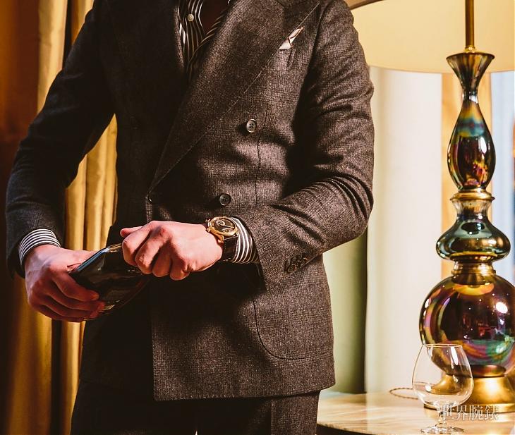 看似单一色调的棕色毛呢西装,细看实由深浅不一的棕色交织成细腻格纹,与腕表上的罗马数字时标,皆具有古典主义低调奢华的风格。腕表面盘隐隐有叁针一线的设计,排列成直线的小面盘与指针,和直条文衬衫相呼应,隐含搭配者着的聪慧与巧思。整体搭配以棕色为主脚,内裡衬以蓝白条纹衬衫,展现俐落与智慧。整体宛如贵族般精致高雅,低调展现王者的奢华。