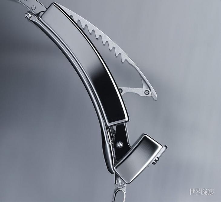 摺叠安全扣一般较常出现在运动手表中,虽然使用起来跟弹簧扣摺叠扣非常相似,但是却增加了安全扣这个保护系统,目的是为了预防像潜水表潜入深海后不会因误触发生状况,让手表能安全的佩戴在手腕上。对于摺叠安全扣的设计,劳力士就发明了Glidelock带扣,双延展系统表带,由抗侵蚀性高的904L不锈钢打造,专为深海环境而设计。劳力士专利Glidelock带扣让潜水员可以每小节2mm的长度,将表带延长至20mm,而摺扣伸缩链节更可使表带额外再延长26mm。