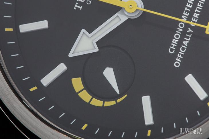 ▲储能显示位在正9点钟,机构上採用的是圆盘涂上游标,即便放诸其他品牌也算是很有特色的设计。面盘下方标注有天文台认证字样,这也是这次自制机芯的卖点之一。