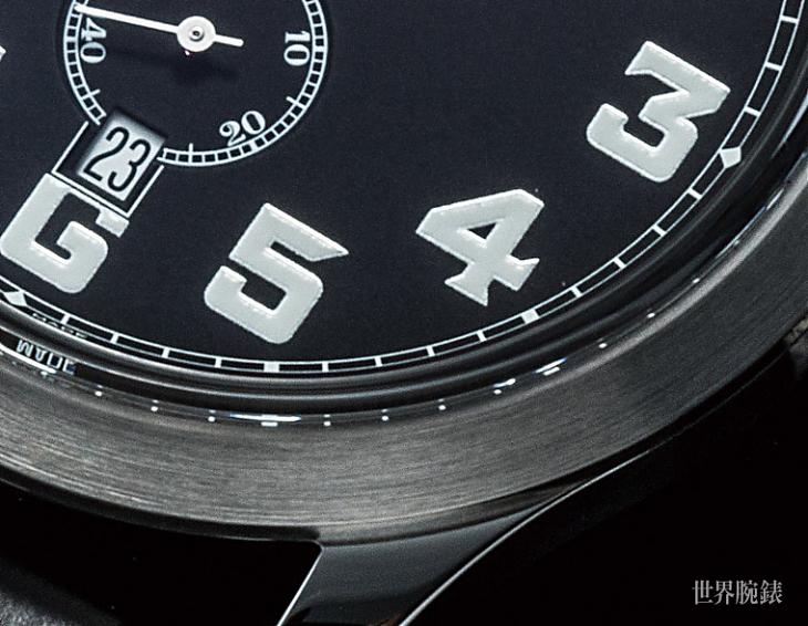 復刻款如实重现了原表款加大、加粗的阿拉伯数字时标,以及能起到绝佳标示作用的铁轨式刻度环,这项设计除了提高读时效率,也反映出战场上分秒必争的紧迫氛围;表圈和表侧处则施以细致的缎磨处理,既增加耐用性也提高表壳质感,这种降低反光机率的消光处理也正是军用表的特徵之一。
