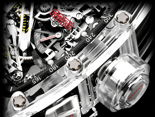 表壳採用整块蓝宝石透明水晶/扭矩及功能显示/鈦合金圆柱齿轮/夹板使用5级鈦合金