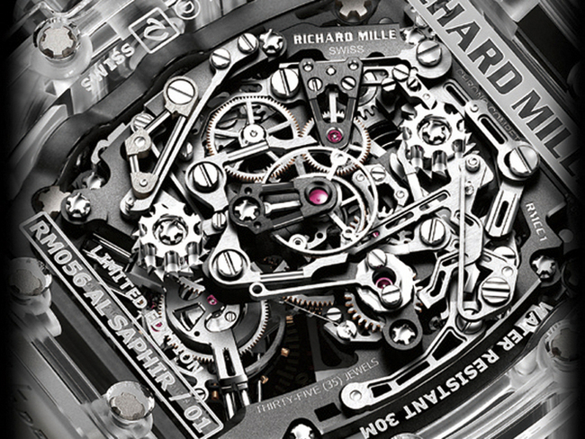 机芯作动的魅力往往要从底盖或是鏤空面盘中才可窥见, 但2012年于 S.I.H.H. 亮相的RM 056却以整块蓝宝石水晶为表身,让所有喜爱机芯的表迷从每个角度直视机芯的美妙作动。
