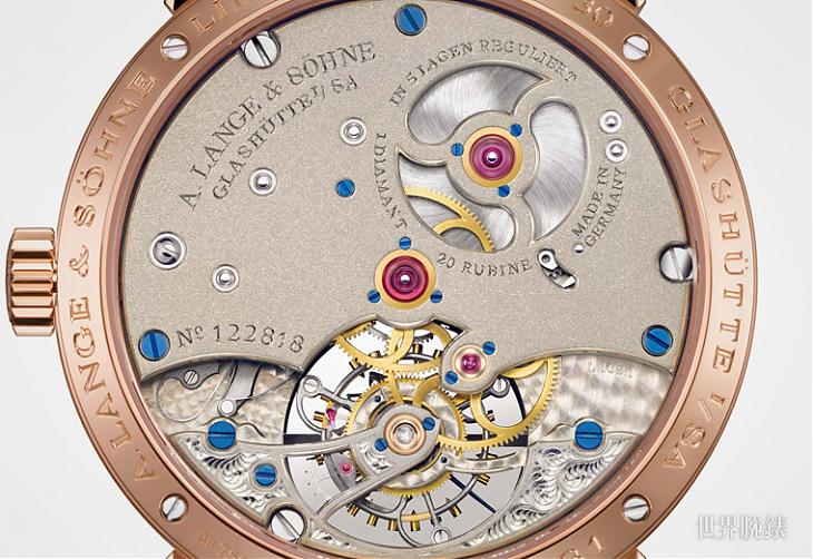 L102.1机芯于德国银机板上饰有源自古董怀表般的粒纹处理,此外机芯零件边缘的倒角与拋光也是朗格扎实表艺的体现,淋漓詮释出Handwerkskunst的精髓。
