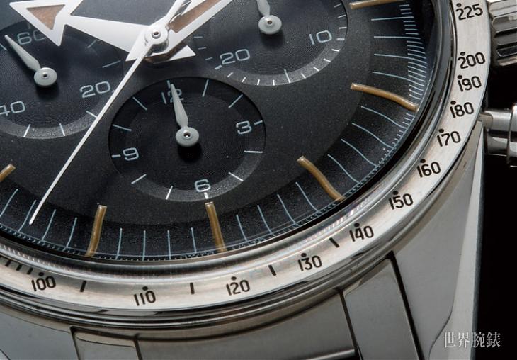 如今计时码表将流速计刻度设在表圈看起来稀鬆平常,不过远在1950年代那时表厂还是习惯将流速计刻度做在面盘外圈,因此当1957年超霸腕表面世时,别开生面将刻度外置于表圈的设计曾让表坛感到颇为意外,成为首见表圈印有流速计刻度的先锋,此举的好处一方面能降低判读时受到镜面反光的影响,同时刻度外移也代表着面盘的佈局能进一步朝更简洁大气的方向转变,所以光是表圈设计的突破,便足以让1957年的超霸腕表留名,这也是2017年復刻版绝对不会遗漏的一大重点。