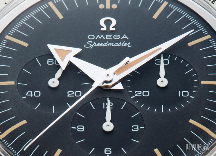 Speedmaster '57 Chronograph将原版的最主要特色——流速计刻度依样画葫芦出来,其仅是在表圈刻字填入涂料的做法比起现代连陶瓷圈都趋于普及化的设计当然简单许多,但是在当时可说是一大突破,赛车手换算平均时速的过程中少了表镜的反射因而更能清晰判读。而在面盘格局方面,下叁眼格局样式虽然简约,但是欧米茄利用大小盘面的高低落差强化了黑面单色调的层次感。围绕在面盘外圈的棒状时标均涂覆夜光物料,原始的用意自然是要让赛车手阅读时间不受环境明暗影响,同样的逻辑也延续到指针造型部分,由这款被暱称为「阔箭」可知指针对它整体的辨识度而言占有相当关键的角色,硕大的叁角形时、分指针对比修长秒针像是呼应时间有小到大单位的紧凑度,而包括分针与时针针尖都涂有夜光物料,再次将运动表讲究的清楚阅时性完美詮释。