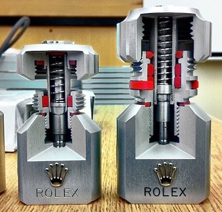 有的人看下来可能会对所谓的双重防水和三重防水感到好奇,究竟它们在功能上和构造上有什麼分别呢?以上的图片左边代表象徵双重防水的双扣锁表冠、右边代表象徵三重防水的三扣锁表冠。据知双扣锁的设计灵感是劳力士从潜水艇的舱口获得启发所催生,包括表壳内部表冠内部都有螺纹,当佩戴者拉开表冠上链或调时完成后,只要再把表冠压回去就把隔绝一定程度的水气。
