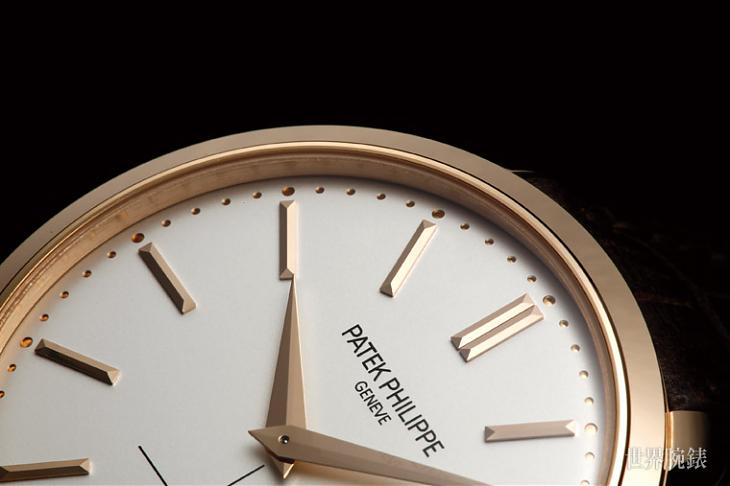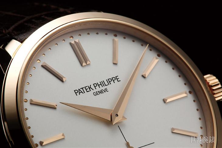 新款Ref. 5123R-001的小时刻度和P1178在12点鐘位置有显着的差异,P1178採用的是阿拉伯数字的"12",Ref. 5123R-001为了达到更简约的美学配置,取消12点鐘位置的阿拉伯数字显示,改以与其他小时刻度相近的柱状立体刻度,搭配玫瑰金剑型指针,展现出一种俐落的大气风范,而面盘中央的"PATEK PHILIPPE"与"GENEVE"字体,也有些许的变化,新款採用略粗的字体,彰显出表款的刚性线条。