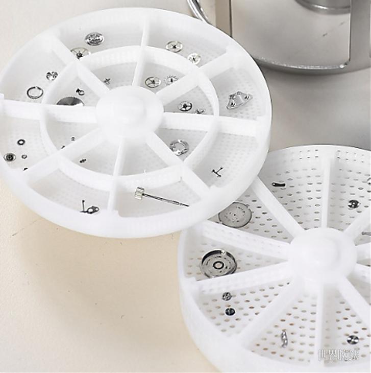 机芯的每一枚组件都放入经特别研究设计、可预防划痕的特氟龙清洗篮,并根据明确界定的操作模式,在备有超声波功能的专业清洗机内进行组件清洗,以全面去除油腻,彻底清洁。