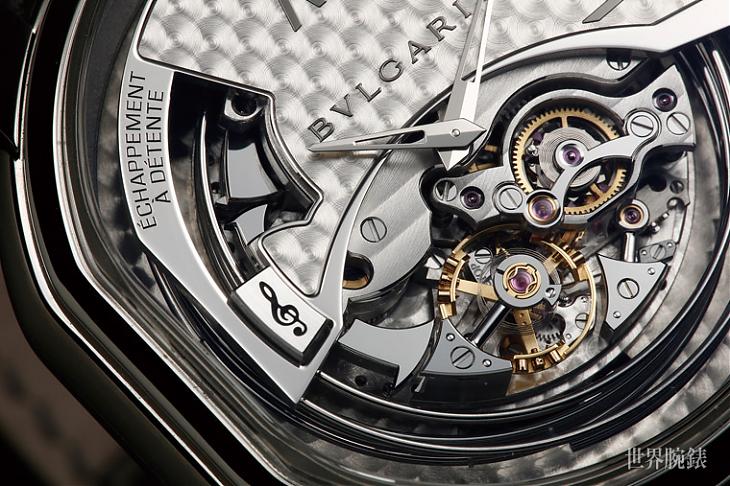 天文台式擒纵虽然少见,不过始终没有被表界遗忘,独立制表不论,即便是主流品牌每隔几年也都会有人再度挑战,而每次新推出的作品针对天文台式擒纵最弱的耐衝击性也都会提出若干防范措施。这款由于擒纵部和报时机构是各自独立的模组,因此针对擒纵部抗衝击的问题可以单独解决,它一方面在擒纵部增设了保险装置,另一方面整个擒纵模组跟机芯主体的连结就是採取浮动式的,凡此都强化了擒纵部的避震能力。
