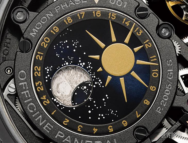 全新PAM00920的P.2005/GLS机芯背面配备日夜显示器,同时透过由两片互相交叠扣连的转盘组成的机械系统清晰显示月相。上层转盘以镶嵌于机芯上的小型外置指针显示一天24小时,以太阳标示白昼,并以星空标示晚上。星空中央设置小圆窗,可供鑑赏下层转盘,它会根据月相的实际盈亏週期(平均为29天12小时44分鐘3秒)每天转动约6.1°,精细的辅助运转令位于下层转盘上的月球形状展现盈亏变化。