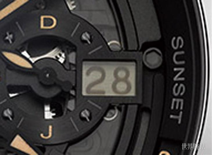 表款的日期显示採用硼硅酸盐玻璃制造转盘,而日期数字的光学特性则则经雷射改良,只有当佩戴者视线与日期窗平行时才看得见上面的资讯。
