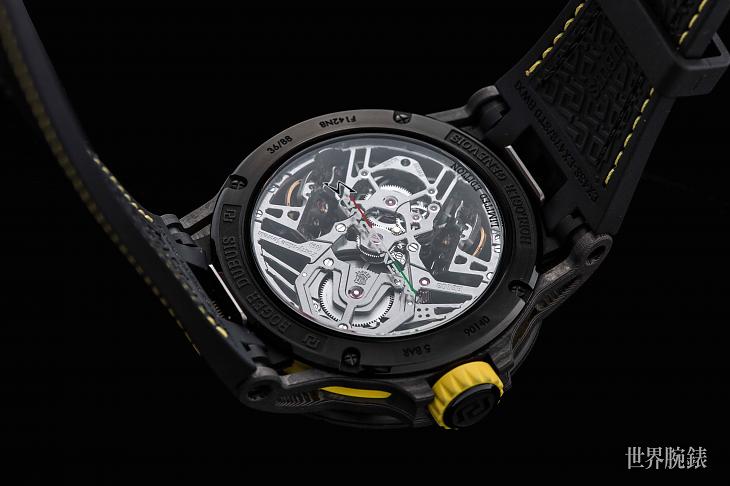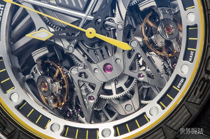 除了策略的考量之外,双方推出的第一个作品也的确令人眼睛一亮,Excalibur Aventador S搭载了独特的双擒纵跳秒机芯RD103SQ,新机芯不但结构复杂,模仿跑车引擎外型的设计在近年这类从车界取经的表款中更是一大杰作。熟悉品牌的人一定马上就会想到这款是2013年四擒纵机芯RD101的简化版;如果单纯觉得擒纵器愈多就愈厉害的话,那麼这款的确可以说是「简化」,但从功能的完整性和设计上的美感来看,事实上笔者反而认为这款双擒纵跳秒的完成度更高。