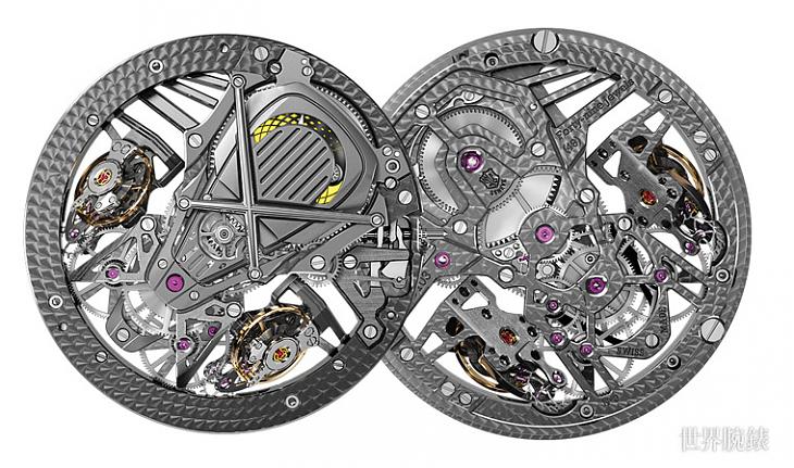 考量到整体的平衡对称,四擒纵的双发条盒分据机芯左右,四组擒纵器则平均地配置在四角;RD103SQ不但擒纵器数量只有一半,发条盒也拿掉了一个,元素较少格局也更自由,因此这次他们让主轮系从位在边缘一端的发条盒直线延伸出来,再将两组擒纵器对称地排列在轮系两侧,发条盒上方的盖板直接模仿了跑车引擎的外观,双擒纵外翻的排列方式也暗示了V型汽缸,凡此都十分具象地将鐘表机芯跟汽车引擎做出了连结。同样成功的例子近代大概只有帕玛强尼的Bugatti和HUBLOT的LaFerrari,不过另外两款根本已经打破了传统机芯圆饼状的造型,相形下RD103SQ是在维持圆形平面的结构下达到近似效果。