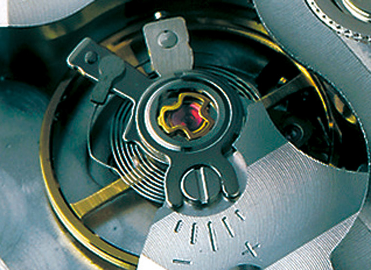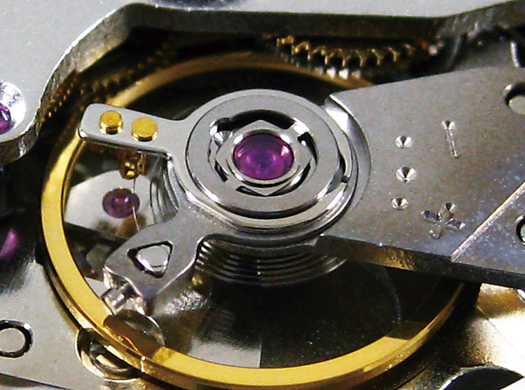 就在同一年,精工也推出新款的Diashock避震器,这款避震器与前述的两款瑞士避震器较为接近,仅有弹簧片略有不同,外型像是特殊的三叶草造型,与盖石的接触点也较多,日后成为精工的主要避震器。但之后精工在7S26以及6R15系列机芯上所使用的避震器,其类似于长方形的弹簧片与先前三叶草式的弹簧片有所不同,但厂方皆通称为Diashock避震器,这是比较特殊的地方。而日本另一表厂ORIENT东方表,因为与精工紧密的合作关系,因此生产的机械表大多都採用Diashock避震器。器