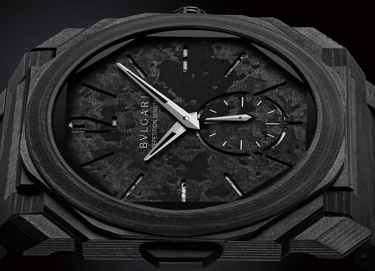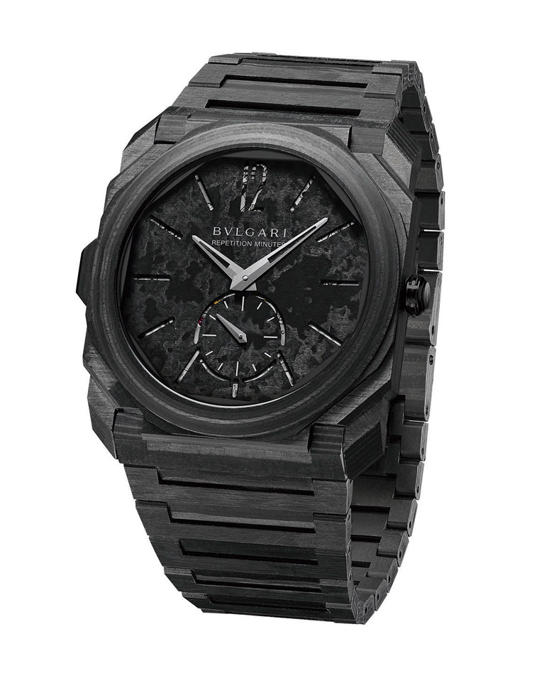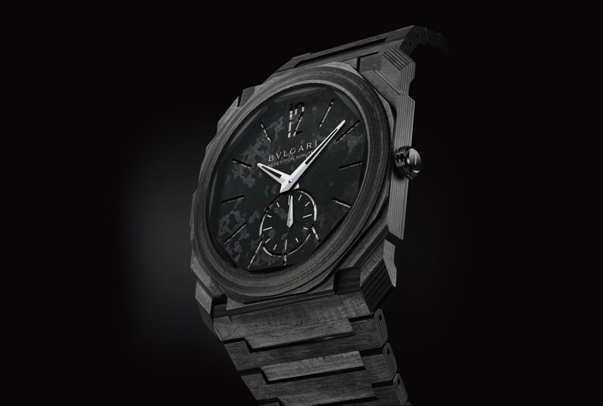 2018年Octo Finissimo系列并未停下前进的脚步,如新作超薄自动陀飞轮配置了环型自动盘,再以全表厚度3.95mm缔造宝格丽第四项超薄纪录,同时包括小三针和手上链镂空腕表等也都有改款新作面世;除此之外,品牌2018年也还有个超薄表的压箱杰作不得不提,那就是材质与外观焕然一新的Octo Finissimo Minute Repeater Carbon。