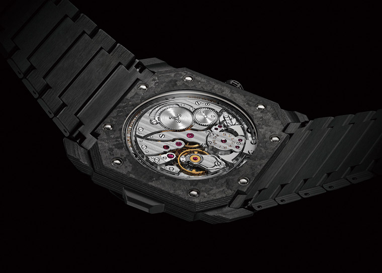 对于表壳材质的研发,宝格丽先前比较偏传统高级表路线,其主力材质不出贵金属以及入门款的不锈钢,只有偶尔出现钛金属或陶瓷材质增添表作可看性,因此这次Octo Finissimo三问表改换新研发的科技材质,予人的惊奇感可能不下于三年前这款表写下的三问超薄纪录。与一般三问表相较,Octo Finissimo三问表在制作表壳时所要考虑的面向更广,除了要找出适合问表传声的材质,同时材质本身是否适合Octo多切面(代表复杂且不易制作)的外观设计又是额外衍生的课题。宝格丽经过了长时间的研发,开创出一种极纤薄的碳纤维材料,这是一种名为碳薄层(Carbon Thin Ply, CTP)的热固性环氧树脂,并将之应用到Octo Finissimo三问表的表壳、面盘与底盖等处,其中唯独表冠是用DLC钛金属打造,由外观的All Black效果可以察觉其碳薄层本色,不过CTP的表面纹路比起印象中交叠有序的传统碳纤维又有所差别,尤其面盘色泽经过光线照射还会呈现深浅不一的不规则感,让这款超薄三问显得极具现代科技风格。有别于2016年钛金属版本,Octo Finissimo三问表这次换上链带设计,链带同样是由CTP材质制作,整体看来更休閒、佩戴上手的服贴度也更高。