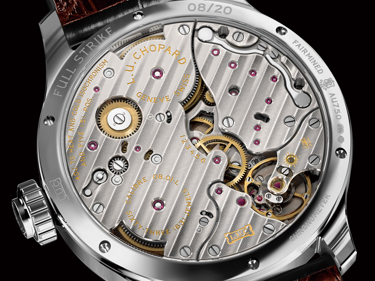 其三,腕表解决了一个三问表极具挑战性的问题:在报时最后一声和报刻第一声之间的静音阶段可能会随着要报出的刻钟不同而变得长短不一。全套的鸣响报时阶段会有三段,分别报时、刻钟和分钟,当中通常会有较长的静音空白,此时佩戴者必须耐心等待,有时还会疑问腕表是否还在运转,不过08.01-L机芯以其精巧卓越的构造跳过这些过长的静音阶段,它时、刻、分的齿轮是重叠的构造,因此互相牵动,当其中一个结束打簧,就会自动启动下一个机制转动,无论要敲打多少次,其间节奏都保持恆定一致。 08.01-L机芯的设计理念独树一帜,传统三问表的机芯通常是两层重叠的结构,一层是测量时间的机制,另一层负责将这测量出的时间转化为鸣响旋律,而这枚崭新的L.U.C.机芯极其精密纤薄,使得L.U.C Full Strike三问表的表壳总厚度仅仅11.55毫米,对于一枚装载远超过500枚组件的机芯而言,这样的厚度实为罕见。
