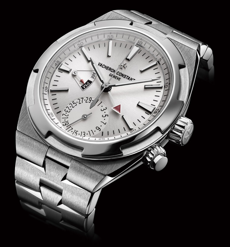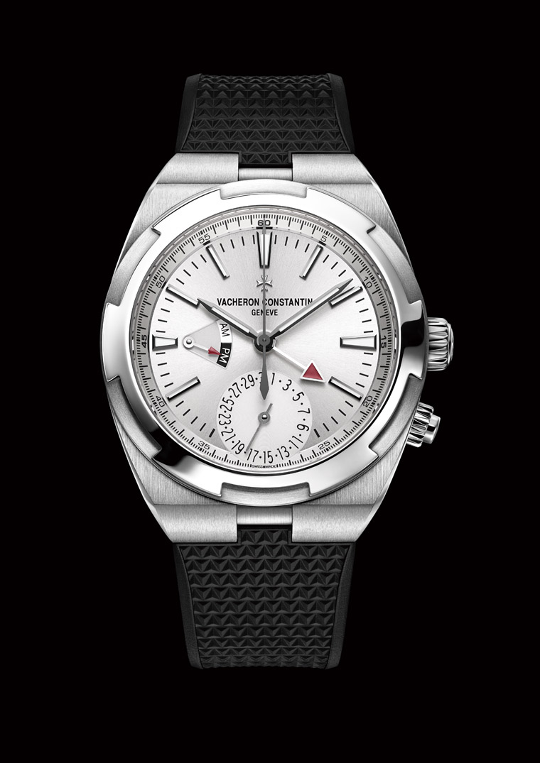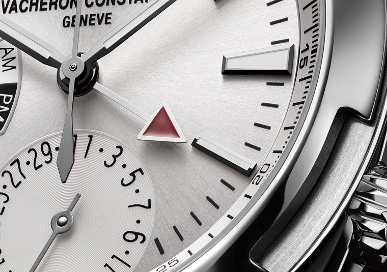 以Overseas系列强调与运动休閒、旅行相关的创作基因来看,先前江诗丹顿已推出过Overseas世界时间腕表这款调性相当合拍的作品,不过该只表搭载的2460 WT机芯还是属于沿用既有作品的模式,为了彰显Overseas重新出发的新气象,时隔两年,品牌这次端出了全新的两地时间机芯作品,一方面它是詮释系列精神的绝佳选择,另一方面还能拓展系列广度。Overseas两地时间腕表首度问世就有多重版本,除了图中所见的不锈钢银面款,另有不锈钢蓝面和玫瑰金银面等组合。表款的造型延续新版Overseas的设计变革,其中表壳4点方向有一枚旋入式按把用以快调两地时间指针。Overseas两地时间腕表因为搭载新机芯的缘故,所以面盘格局无论就系列本身甚至品牌旗下各线作品而言都极具新鲜感,其以面盘中轴的第四枚指针来指示原居地时间,不锈钢银面款的两地时间指针针尖採用红色顏料强化视觉效果,对应到面盘9点方向的(原居地)日夜显示指针针尖也同样採用红色,阅读时一目了然,就连日夜显示的"AM"和"PM"刻度也分别用上白底与黑底以资区辨。至于面盘6点方向还设置了指针式日期盘,赋予表款更充实的实用性。