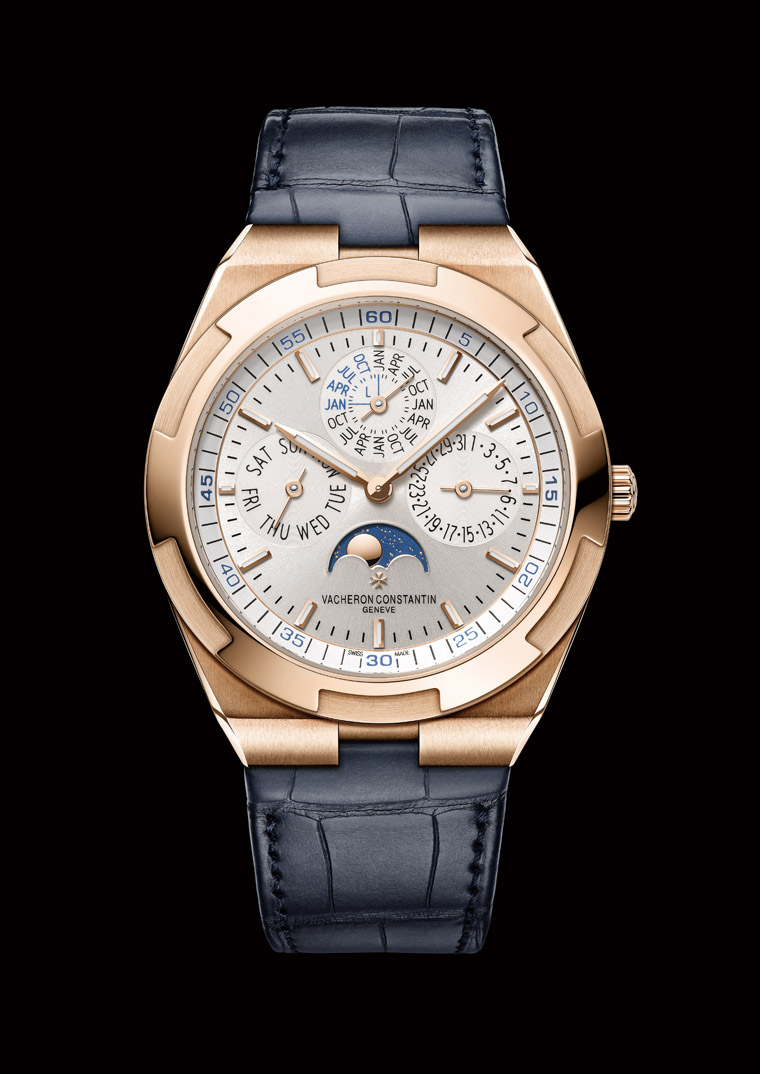 玫瑰金款的Overseas超薄万年历此次面盘换上银白配色,优点是能让面盘上的蓝字刻度(包括分钟刻度以及闰年月份等)更加突显,另外像是时标、指针甚至是月相盘上的月亮与星星等,也都因应表壳更换材质而同步改为玫瑰金,使整体视觉感受趋于统一和谐。表款搭载的1120 QP/1机芯特色就在于仅4.05mm的超薄设计,翻至表背会发现机芯的22K金自动盘被改为新版Overseas系列专属的风向玫瑰罗盘造型,对于机芯的上链效率或赏玩收藏价值都有实质助益。此次Overseas超薄万年历为人称道的表带快拆设计除了备有链带,更配置了蓝色鱷鱼皮带和橡胶带,搭配起来既显尊贵,也显现一股优雅风范。