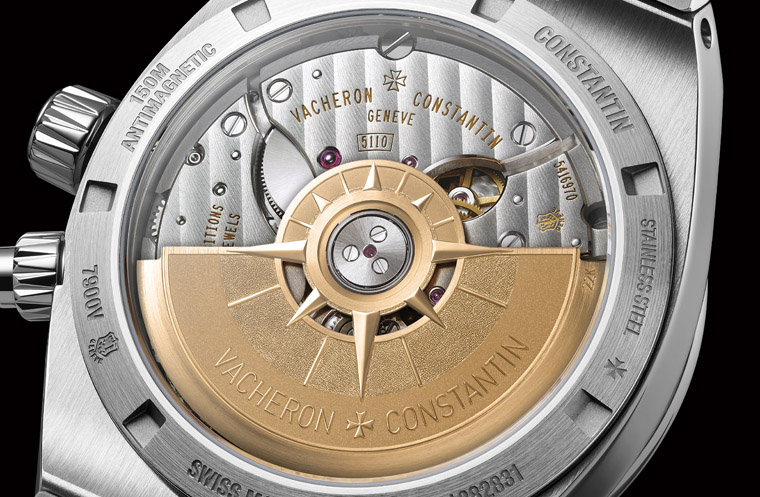 5110 DT机芯就算搭载于不锈钢款式中也大方使用K金自动盘,由自动盘的造型可以反推这是Overseas系列独享的成员血统,此枚新机芯宝石数来到37颗、摆轮震频4Hz,动力储存则有60小时的空间,而5000系机芯从刚推出时就强调将全面获得日内瓦印记的愿景,这点在5110 DT机芯还是坚定不移,就零件作工以及机芯运作品质等层面而言,都是通过客观检测的真材实料之作。