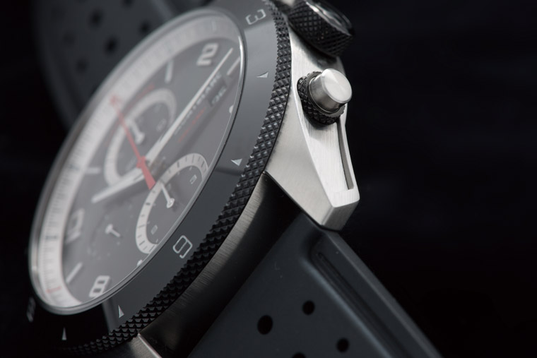 除了这些细节,表耳整体的线条也都做了修改,原本的表耳较细,跟表壳接合处的区隔明显,相对地新版则是从中壳的曲面顶点一直线连下来,表耳和表壳更有整体性,也大幅改变了表款的外观轮廓。表面上的元素不多,而且几乎都有明确的功能性。在今日制表业成熟的加工品质下,这些简单的元素也都具备相当的细节,比如说上下两个计时盘都做了立体化,主盘面也刷了放射纹,用料的部分也是,全系列每款的表圈都是全陶瓷的,这点在销售上对讲究CP值的消费者来说应该也很有说服力。