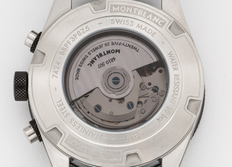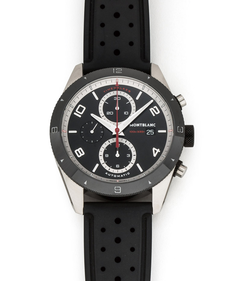 不锈钢、陶瓷材质/MB 25.07自动上链机芯/时、分、小秒、日期显示/计时码表功能/蓝宝石水晶镜面、透明底盖/防水100米/表径43mm/参考价:约NT$ 138,000