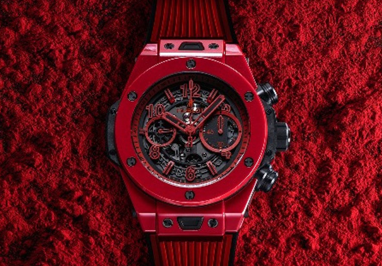 ▲HUBLOT研究了4年,制作出色调与法拉利跑车一样的红色陶瓷,2018年巴塞尔钟表展中推出全红色的Big Bang Unico Red Magic。图片来源:HUBLOT