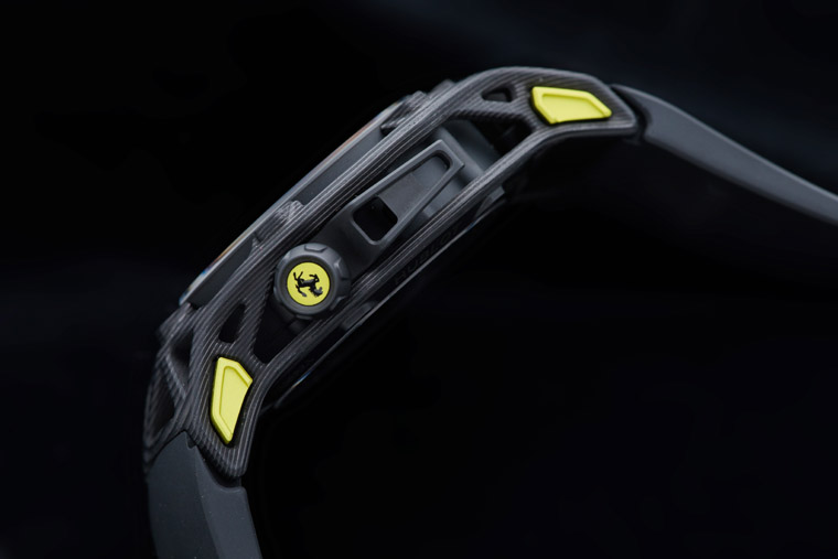 Techframe法拉利陀飞轮计时码表并不只是简单掛上法拉利Logo就交差了,实际上表款的造型设计乃是交由法拉利设计总监Flavio Manzoni所领导的团队擘划,至于表款包括材料应用、机芯工艺等从理念到具体化的过程则是由HUBLOT负责实践,造就顶尖超跑与专业制表两大领域巔峰之作。法拉利设计团队将Techframe法拉利陀飞轮计时码表的机芯视为超跑引擎般,他们打破传统用表壳来包覆机芯的做法,而是将机芯外部当作车架支干的概念来保护、固定机芯,从其大范围镂空塑造出浑然天成的流线轮廓中隐隐让人联想起跑车的下压尾翼,优点在于维持高强度的同时还能达到轻量化的效果,并带有空气力学的考量,佩戴时彷彿手腕的活动也变得更顺畅轻盈了些;同样基于空气力学的考量尚包括表款将表冠挪移到了外部4点钟方向,由此缩减横向的体积,至于外部3点钟方向类似超跑脚踏板的装置则是操作计时功能的单按把,相对大型的按把使用起来也更加顺手。