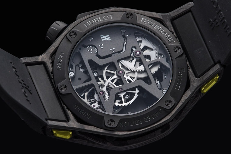 ▲HUB 6311手上链机芯基板经过重新设计后散发现代科技感,其兼具计时码表与陀飞轮等功能使得机芯结构显得复杂而精妙,透明底盖让人有机会一窥极致瑞士制表精髓。