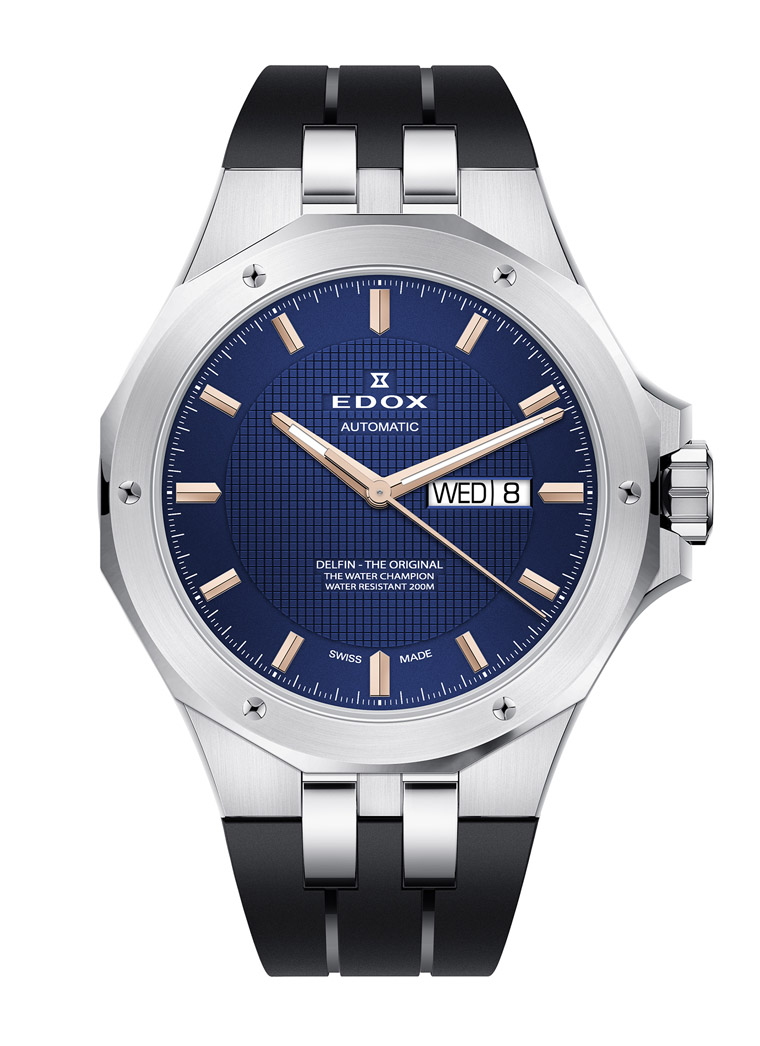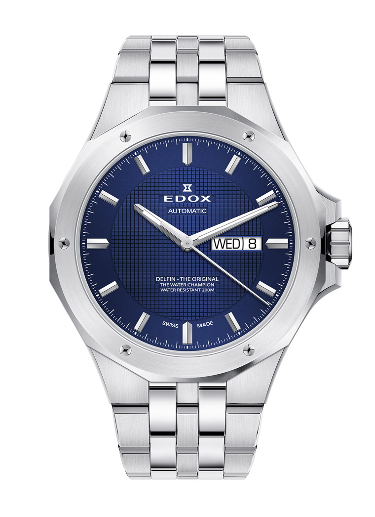 EDOX Delfin海豚系列最初发表于1961年,当时为腕表的防水功能画下了重要的里程碑; 瑞士伊度表于 2013复刻再度推出以胜利的姿态回到腕表的舞台上。以超过50年的防水表专业领域经验重新演绎Delfin腕表,经典的复古表壳造型保留原创精神,特有1970年代表壳、十二边形表圈设计。海豚系列新款自动星期日历表在台湾正式推出,再度引领风潮 ; 採用 EDOX SW220-1自动机芯,拥有坚固的强化的双层后底盖,表底盖上鐫刻水上冠军的标志,沿袭之前的骄傲即使在深海高压的环境中也能顺利运行。 提供机械/石英及天然橡胶带/不锈钢链带不同的选择。Delfin海豚系列具有特殊设计的强化双层防水后盖,并拥有专利的双胶圈表冠系统和在机芯及表壳间加强防撞保护垫具有坚固的防撞击能力,防水可达200米。
