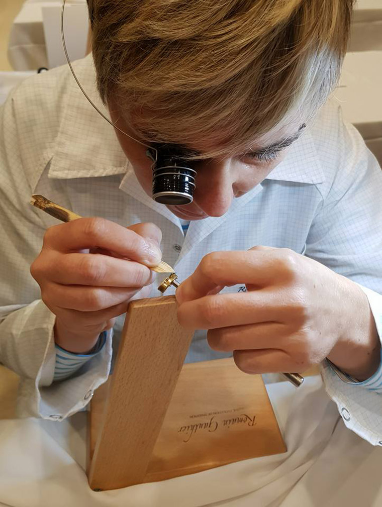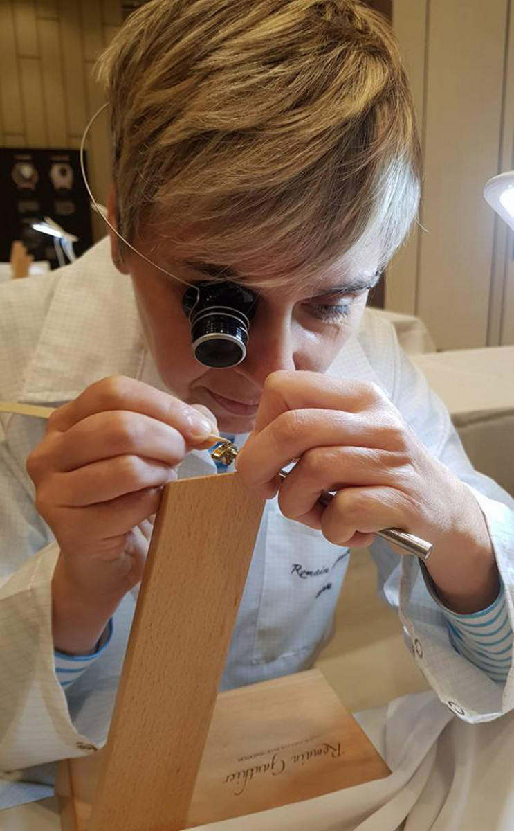 ▲品牌机芯装饰工坊负责人Sylvie Devaux亲自示范以钢制挫刀做边缘斜角拋磨。