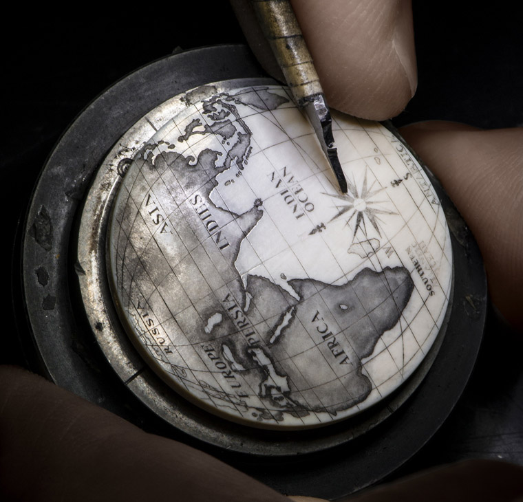 超凡卓越的工艺及创意一直深植于伯爵的基因中。伯爵从不侷限于特定形式的艺术,甚至以制表工艺鲜用的技术制作精美腕表。才华洋溢的雕刻师日以继夜锻链技艺,在日常作息中展现对完美的追求,以作品呈现一丝不苟的精湛成果。贝雕乃诞生于18世纪的雕刻工艺,原为捕鲸者在冗长沉闷的海上生活中消磨时间的娱乐。贝雕使用的素材是鲸鱼及海象牙齿,以及不同哺乳动物的骨头,常以捕鱼情景或书籍插画为图案。18世纪的水手使用缝制船帆的针、煤灰,甚或烟草汁,为雕刻着色及润饰。时至今日,贝雕的本质并未改变,昔日精准细腻的技艺几乎原封不动保留至今。贝雕属于针式雕刻技术,雕刻素材的密度必须极高,表面平滑无瑕,才能绘画纤细线条。为了保护濒危物种,现今的雕刻师需要寻找其他合适的新物料,长毛象象牙化石就此成为象牙及鲸鱼牙的替代品。如此美不可言的新式素材,历史动輒可以上溯40,000年之久。伯爵特别邀请业界最享负盛名的巧手工匠,为面盘添上瑰丽雕刻。名副其实的贝雕大师Richard Maier活用深厚的绘画及雕刻知识,为伯爵创制令人惊嘆的「世界地图」面盘。伯爵从古代地图擷取灵感,再次带领我们环游世界。雕刻师在面盘表面塑造出拱形效果,海洋与大陆在球面渐次成形,再以微细圆点连成虚线,或是紧密堆积,缔造坑纹及浮雕效果。迷人的世界地图上巧夺天工的细节极度细致,只有在放大镜下才能仔细欣赏。过程中,工匠不时以钻石銼打磨凿针及微型雕刻刀,以确保线条准确精微。完成面盘雕刻后,雕刻师以油墨赋予图案生命,突显精致细节,并加强对比。黑色油墨渗透刻纹底部,深化表盘上的细致笔触,微妙的光影效果为未着墨的刻点带来柔美雾面光采,令地图犹如绘画在羊皮纸上。Altiplano 38毫米腕表,面盘饰有世界地图,绝对会成为鑑赏家及非凡珍品腕表收藏家的心头好。
