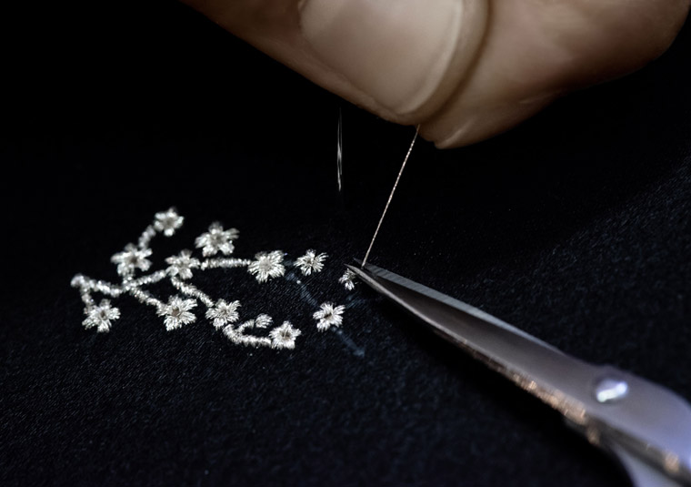 伯爵于面盘融入金线刺绣,再创另一制表界先河。刺绣艺术的确实起源已无从稽考,但大量来自不同文化的古代文献均显示刺绣艺术已流传多年,各式彩图刺绣及不同质感的线段于綾罗绸缎上幻化出形形色色的瑰丽装饰。贵为丝绸之乡的中国最先掌握这种世所渴求的原材料,发展出无与伦比丝绸刺绣技术,丝绸亦顺理成章成为这种巧夺天工技艺的完美画布。伯爵秉承优越传统,悉心挑选金线刺绣这项从未应用于表盘制作的技艺,制作全新腕表的面盘,成果惊为天人。金线刺绣腕表的制作程序由把丝绸伸展和安装在承托装置上开始,然后进入绘图阶段,刺绣大师在丝绸上勾划图案的轮廓线条,接着以针尖制作白金线 (Cannetille),这种纤细的金银丝元素由珍贵的金线旋转扭曲而成。大师将白金线绣上丝绸布料,一针一线将细节逐一呈现眼前,过程需要耗费冗长时间,极度讲求耐性。月桂叶图案则採用绢质缝线及直针绣法,单是刺绣这个图案就需要五小时工序及长达三米的珍贵丝线。