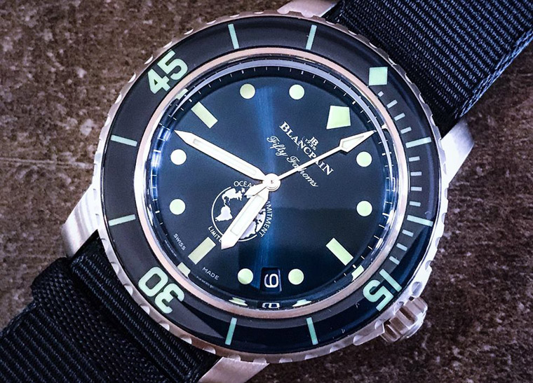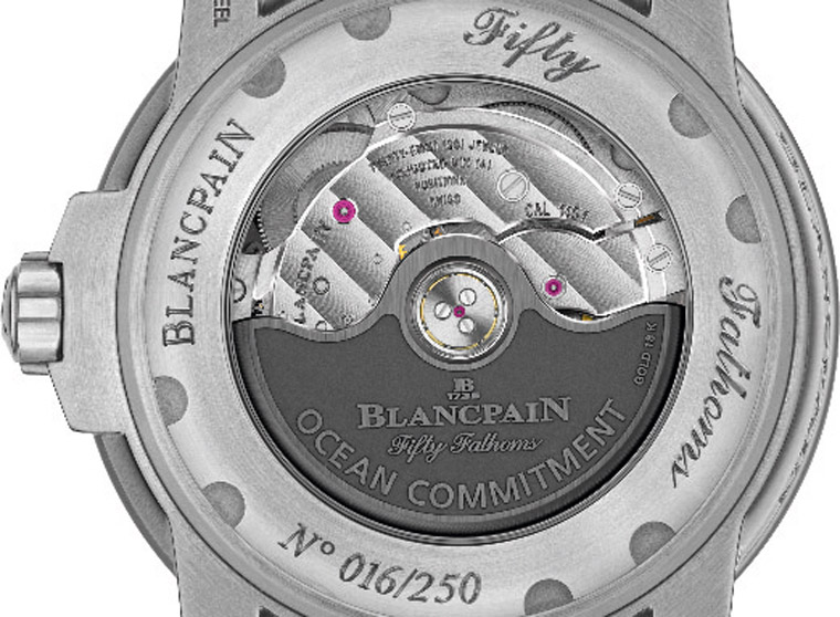 2018年宝珀延续2014和2016年皆推出为保护海洋环境而特设的公益表款——「心系海洋」限量版,与之前不同的是,前面两代心系海洋限量版都是以Bathyscaphe系列为基础,发展到第三代宝珀才终于把目光移回五十噚系列身上,这款五十噚心系海洋限量版搭载1151机芯,设计上和先前五十噚系列大同小异,但是包括採用蓝色面盘、表圈,并在面盘六点方向加上「心系海洋」公益事业的Logo等专属设计,都让这款限量版多了更诱人入手的吸引力,更别提它只限量250只、每售出一只宝珀还会捐出1000欧元作为支持保护海洋公益之用,显得格外有意义。