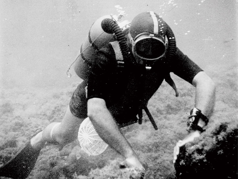 ▲1950年代宝珀执行长Jean-Jacques Fiechter在进行潜水活动时,不忘测试宝铂五十噚的功能,一手佩戴三只腕表以完成实际佩戴后的心得报告。