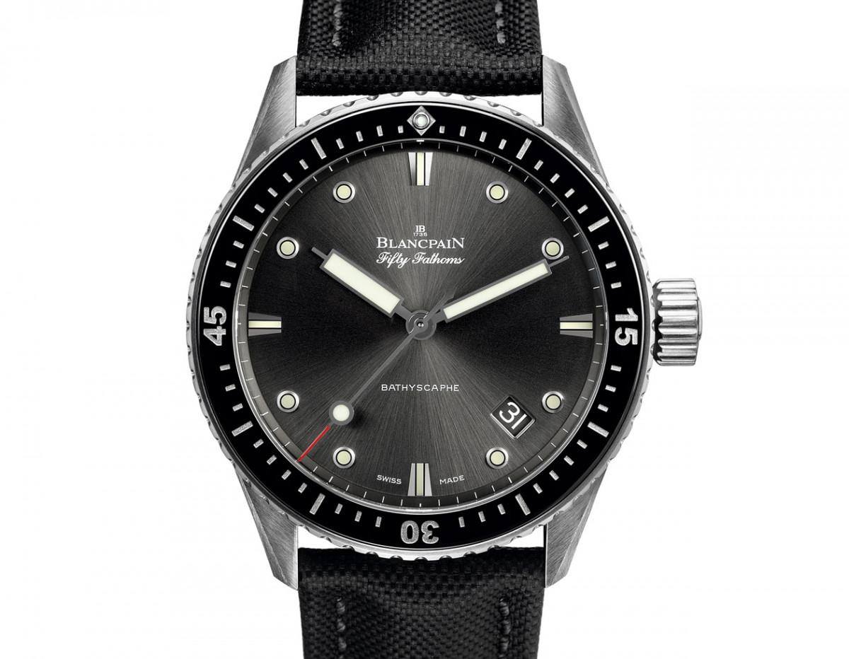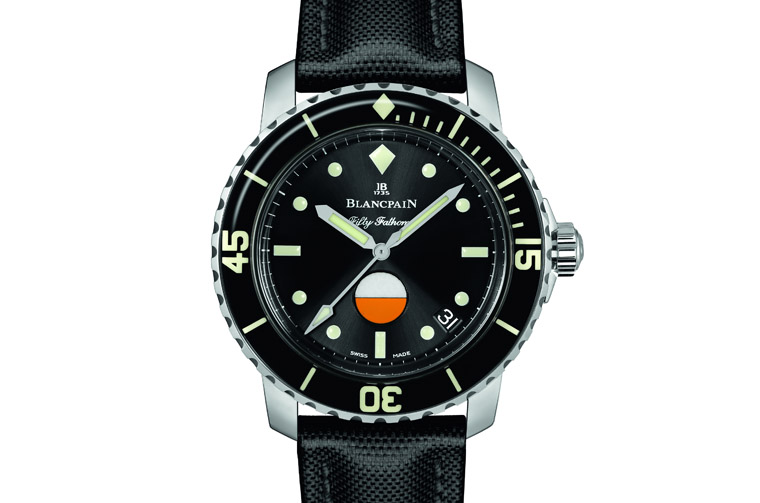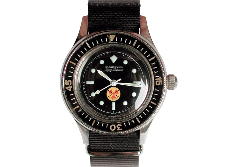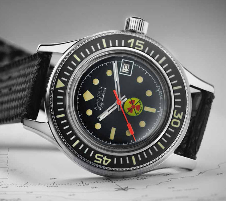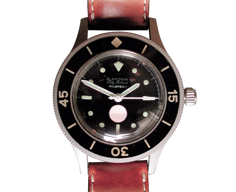 此为US MIL-SPEC海军款,大尺寸的41mm在面盘布局上显得精炼不少,当初宝珀引进美国时与当地商人Tornek合作,Tornek在美国建造了一座小型的测试实验室,让五十噚得以在美国发行,其独特之处除了面盘的"MILSPEC1"字样,更採用与其他五十噚不同的雾面表壳。