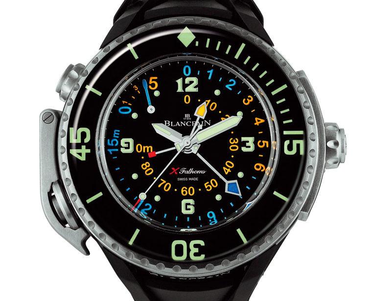 X Fathoms概念表集结多项全球首创技术:可计算达90米的深度,并记录下潜的最大深度;另外独立出的0~15米潜水刻度显示,其误差值仅在30公分上下;减压所使用的5分钟逆跳停止计时功能。X Fathoms搭载9918B机芯,为宝珀工坊所打造 Cal.1315机芯的延续,已成功运用至数款五十噚系列之作中。