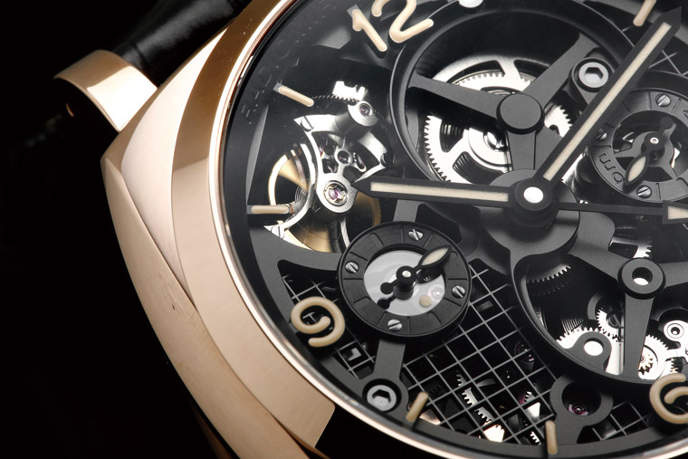 此只腕表11点钟位置的陀飞轮每30秒旋转一周,比传统陀飞轮的转速快一倍。且框架垂直于平衡摆轮的轴线上,捨弃传统的平行方式,能够有效地抵销因地心引力导致的位置误差,让腕表走时更精准。除了陀飞轮之外,腕表同时还搭载了两地时间显示,让时常要出差的旅人能随时得知家乡时间与目的地时间。此外,品牌还特别设计快速调校系统,能以一小时一格的方式转动时针,不影响分针的走动,让旅人能简单地调校时间,相当便利。 腕表面盘还採用镂空设计,佩戴者除了可清楚观赏11点钟位置的垂直式转动陀飞轮之外,还可观赏位于1点钟位置,具备六日动力储存的三枚发条盒,其中的发条可以很清楚看到。而腕表背面还设有动力储存显示,提醒佩戴者要记得为腕表上链。