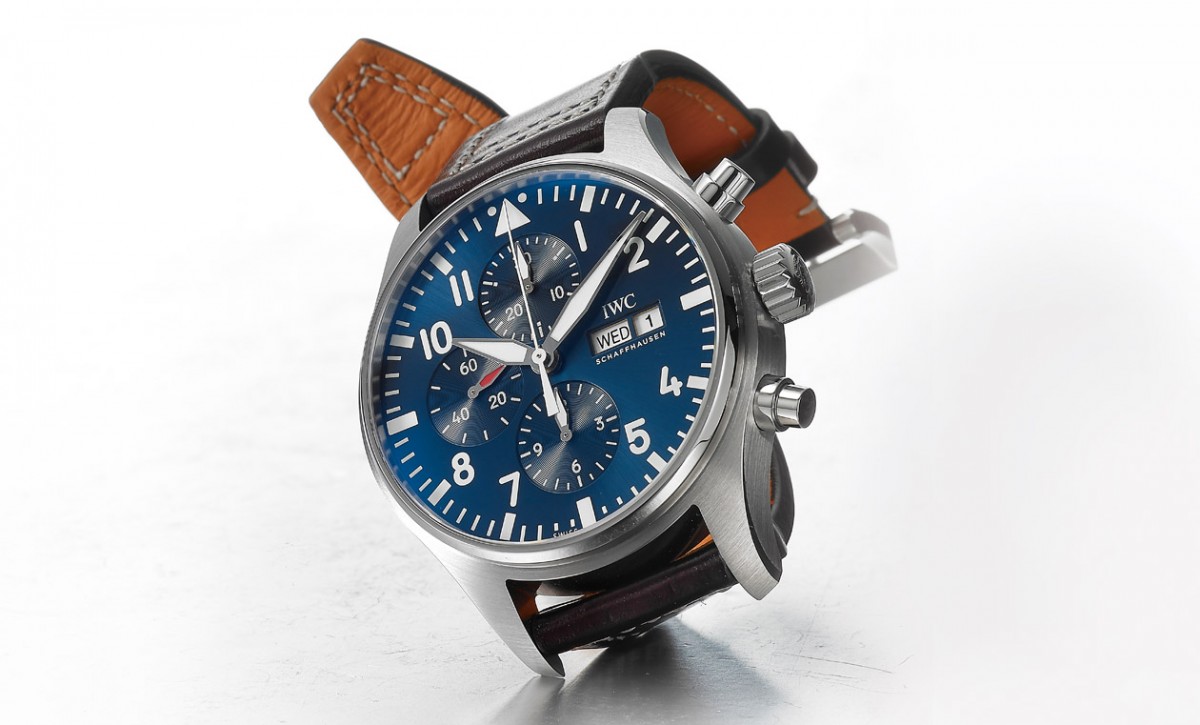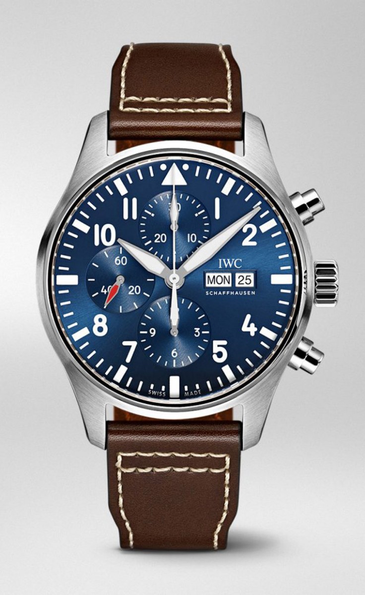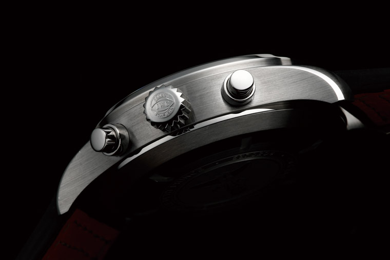 ▲手表採用飞行表标志的43mm不锈钢表壳,表冠上鐫刻有IWC的标志Logo。透过2点钟以及4点钟的计时按把,能轻易计时。