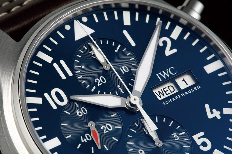 ▲飞行表偌大的时标以及剑形指针让飞行员能够清楚读时,而位在9点钟的小秒盘指针特别使用红色标示,让佩戴者容易区别时间。