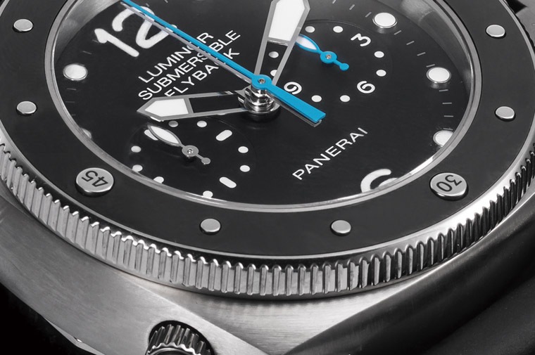 沛纳海也在这两只潜水表的橡胶表带上印有沛纳海蓝的OP标志。两只腕表都搭载飞返计时功能,可以让指针归零并立即重新开始计时,省却先停止秒针再归零的步骤。腕表的停止与启动计时按把位于10点钟的位置,而8点钟位置为飞返按把能够将停止计时的指针瞬间归零。而腕表使用了双色夜光涂层,表框上的圆点以及分针上皆使用蓝色夜光涂层,时标以及时针则使用绿色夜光涂层。