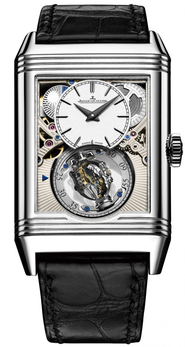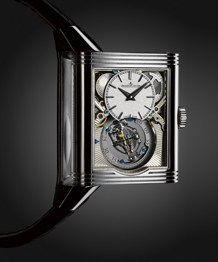 Reverso Tribute Gyrotourbillon採用铂金材质,外壳造型与2008年的Reverso Gyrotourbillon 2对照,会发现表款明显「瘦身」有成,不仅由侧面的厚度可以察觉,就连表圈的面积比例也下降许多。表款正面面盘具有偏心时、分盘以及6点方向的球体陀飞轮,偏心表盘採用粒纹装饰处理搭配轨道式刻度与剑型时标,建构清晰读时的格局,而在表盘11点方向还可见到一枚日夜显示盘,积家用太阳与月亮图腾指示天色变化非常直觉易辨。此外陀飞轮框架周围设有60秒的刻度环,再结合陀飞轮9点方向旁的一枚蓝色三角指标便可视为小秒运行指示,陀飞轮周遭的机板表面更饰有太阳放射状扭索饰纹,彷彿由陀飞轮本体发散出耀眼的光芒般,引导佩戴者视线自然集中其上。翻过面盘之后则又是另一个全新天地,同样在12点方向和6点方向各有偏心表盘与呈现3D旋动的球体陀飞轮,偏心表盘为两地时间显示,且在2点方向也设有24小时制的日夜显式环,显示环以阿拉伯数字刻度取代图腾,再以金色和蓝色背景突显天色明暗。