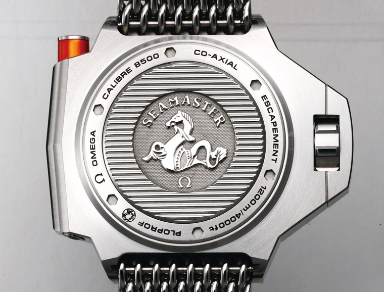 为了方便维修,本款腕表採用两件式表壳,也就是分为表壳主体与旋入式底盖两部份,与当年的600米潜水表採用的设计不同。此外编织状的不锈钢链带,与当年的设计完全相同,但是在表扣内侧採用可快速按压的结构,使用者可以轻松的微调长度;同时表扣内另设有延长摺叠扣,以符合穿着潜水服后的手腕宽度。表壳内部搭载欧米茄8500同轴自制机芯,具备双发条盒与精密的同轴擒纵装置,採用无卡度游丝摆轮并通过瑞士天文台认证,较旧款的1002机芯提高不少等级。
