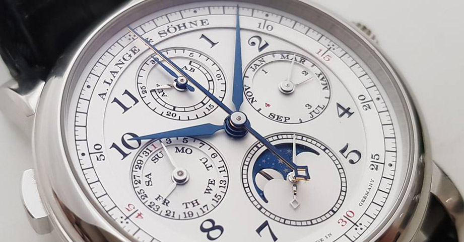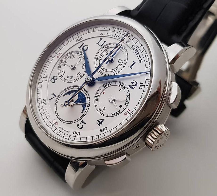 图为朗格1815追针计时万年历表,功能相当于PP的5204,不过还多了能量显示功能。