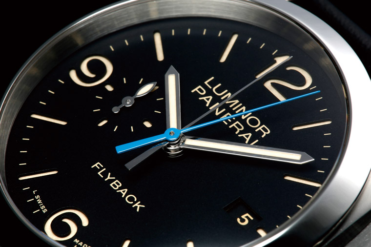 表款配置了黑色面盘,棒状时标和数字呈现在面盘上,3点钟方位设日期视窗,而9点钟方位则设小秒盘。表盘结构採用沛纳海于1930年代末的三明治设计,即使在极其微弱的光线下也能确保极高的辩读性能。它由两片重叠的薄板组成,上层薄板在对应时标数字的位置做镂空处理,Super-LumiNova® 超级夜光物料的光芒由此透射而出。