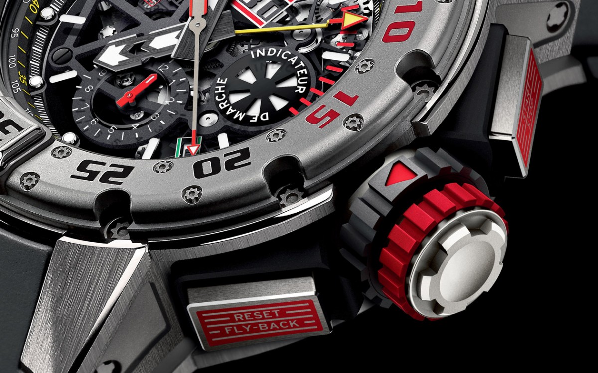 另一方面,RM 032腕表为避免外部压力影响或无意操作,RICHARD MILLE特别开发了具有锁定功能的表冠,只要旋转表环就可以锁定表冠和按键(未锁定为绿色指示,已锁定为红色指示),这可防止对表冠的重压或震动而损坏机芯,并加强密封圈提高防水性能。RM 032的表壳是钟表界最难生产的表壳之一。经过1个半小时的车削后,这种三件体表壳还须经过9个小时的铣削,共830道工序。11个小时的切削加工过后,每一枚表壳必须经过一整天的品质检验。按键及其元件和表冠需要10天的加工过程,其中包括大量防水测试和品质检验以及表壳的手工打磨和拋光,只能说每一只腕表都得来不易。