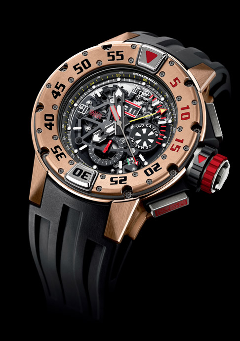 玫瑰金材质/RMAC2自动上链机芯/时、分、秒、大日期、月份显示/逆跳计时码表功能/蓝宝石水晶镜面、透明底盖/防水300米/表径50mm