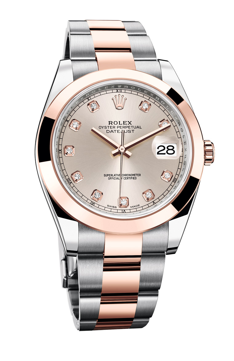 126301/玫瑰金钢材质/3235自动上链机芯/时、分、秒、日期显示/时标镶钻/蓝宝石水晶镜面/防水100米/表径41mm/参考价:NT$ 386,000
