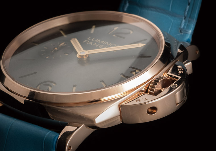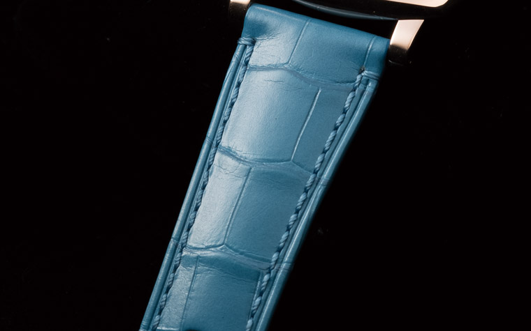 表带也是沛迷们热爱的原因,因为极简的棒状时、分针设计与外型已经成为首要瞩目焦点,但这就像是一把上好宝剑也需要与其品质相应的剑鞘一样,戴沛纳海换上不同的表带就拥有不同的风格,譬如常见的深棕色小牛皮表带是基本款,换上最近很夯的深蓝色鱷鱼皮表带,就给人相当时髦新潮的感受,所以想要换换口味的表友,就会想要换上一个新色给自己的腕表一个新气象,沛纳海本身所售的表带顏色就相当丰富,但PAM00677让人更惊喜的是,它不像沛纳海以往款式所搭配的沉稳表带(以黑色或深棕色为主),PAM00677搭配的是清新的浅蓝表带,搭配Goldtech金表壳的色泽,在贵气中带有一股年轻的活力,也让人直接省去了搭配新色表带的困扰。
